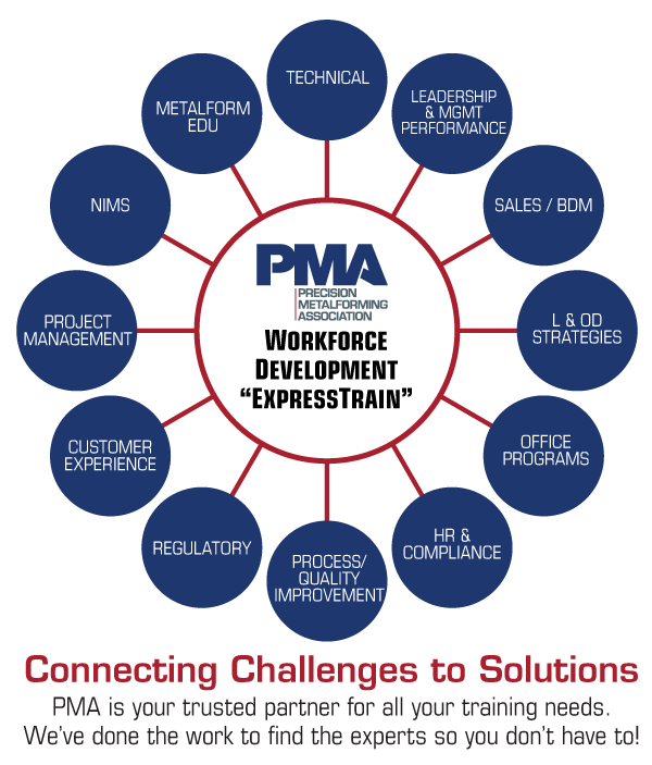 Have a challenge at your company that needs special, focused attention? Need more on the job training (OJT) and don’t have the people to do it? PMA’s custom training program—”ExpressTrain“—has vetted industry experts that can bring unique, personalized instruction and attention directly to your employees. Virtually, hybrid or onsite, we work with you to use your data, people, case studies, machines, environment and processes to create specialized programs designed to help you meet your needs.