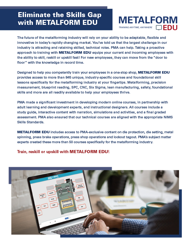 As a premier manufacturer and stamper of small metal parts, their employees are required to have a specific level of skill and precision. When Small Parts looked to expand their training efforts, PMA’s METALFORM EDU provided the training programs they needed to succeed.