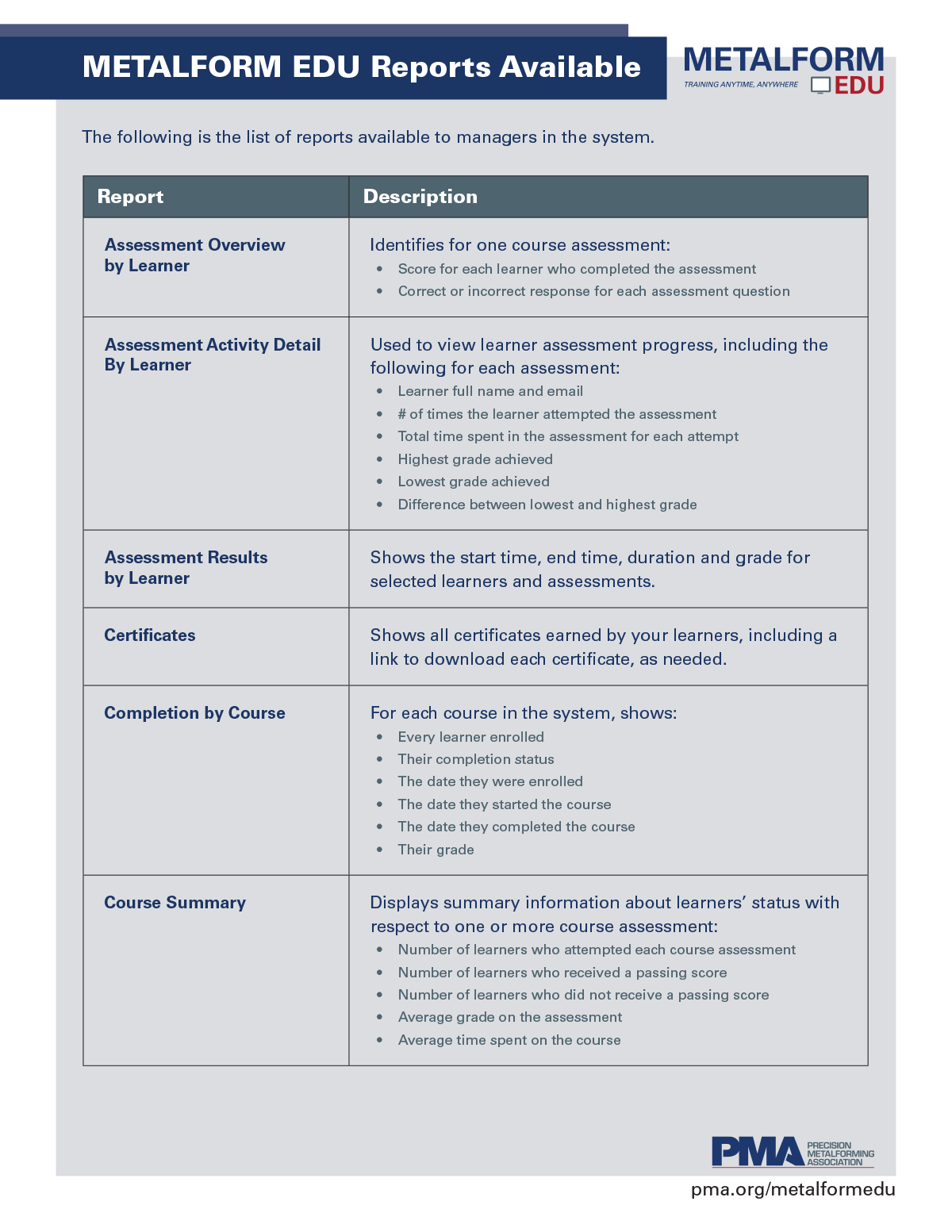 Typically, most METALFORM EDU company admins will have a discovery call with PMA staff to go over the system, understand your needs and then provide a solution to meet those needs. To setup that meeting, just fill out this form and a PMA staff member will schedule a discovery call with you.