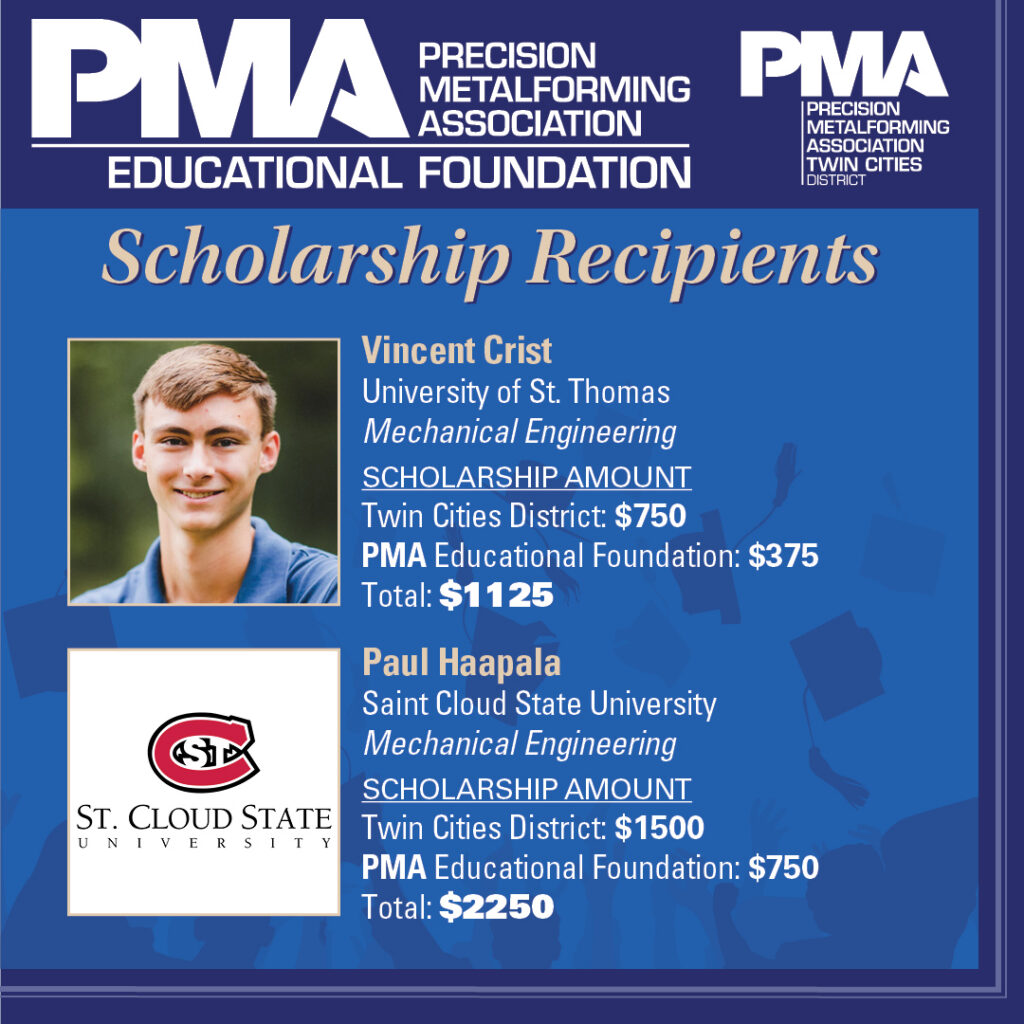 The Precision Metalforming Association Educational Foundation (PMAEF), in partnership with the Precision Metalforming Association Twin Cities District, has awarded scholarships to local students seeking careers in the metalforming industry.